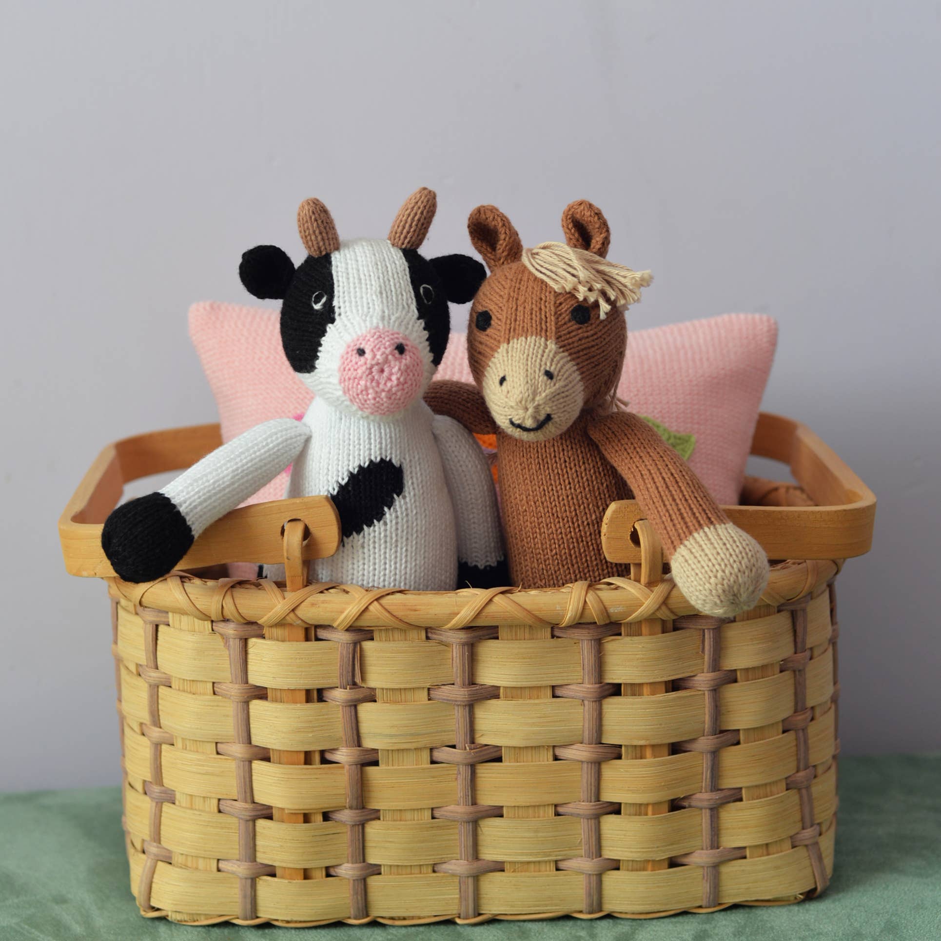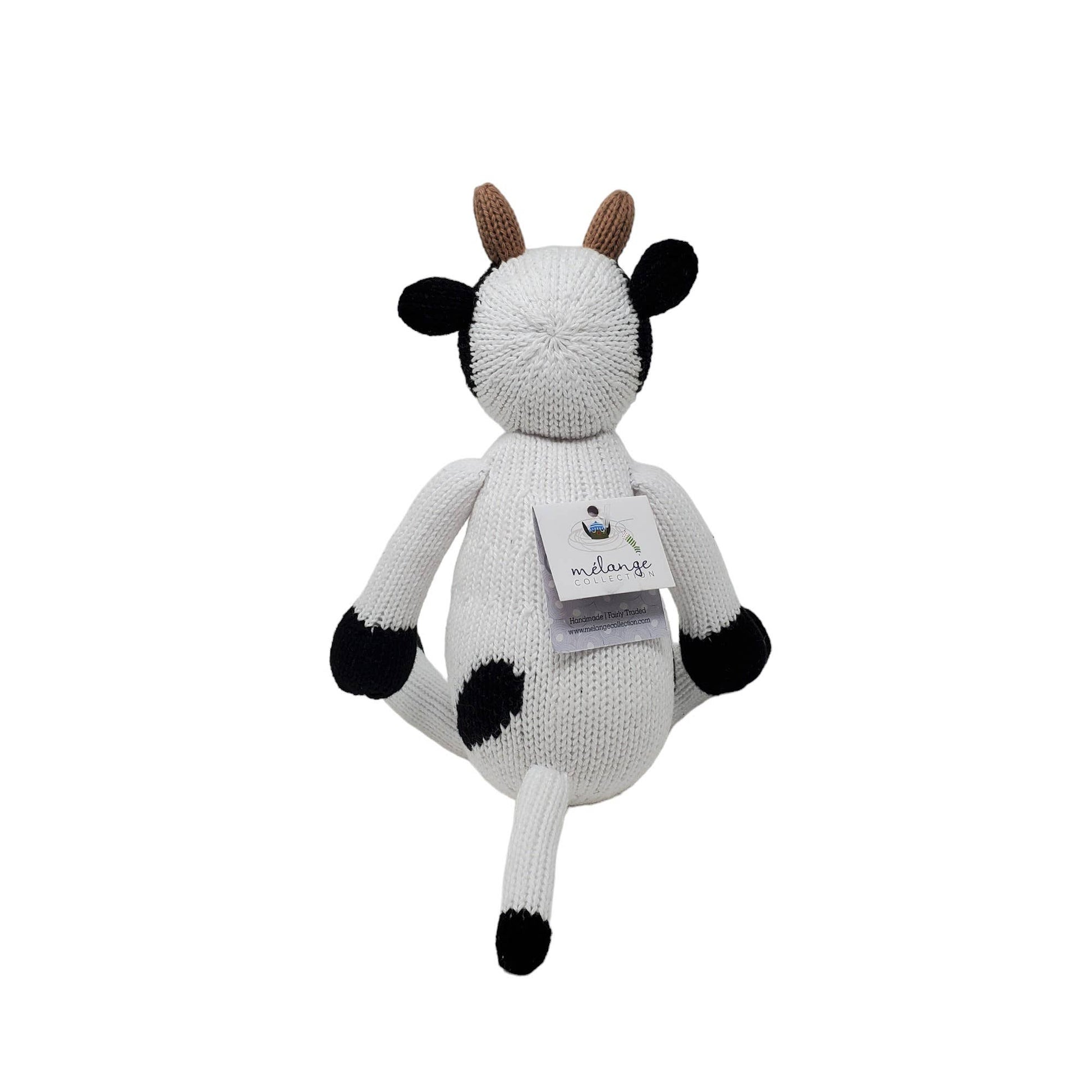 Bring some barnyard charm into your child's world. This knit cow stuffed animal serves as a endearing playmate, a reminder of the countryside, and a cozy companion for any child's imaginative adventures. With its combination of softness, visual appeal, and attention to detail, this black and white knit cow is sure to become a beloved member of the toy family.