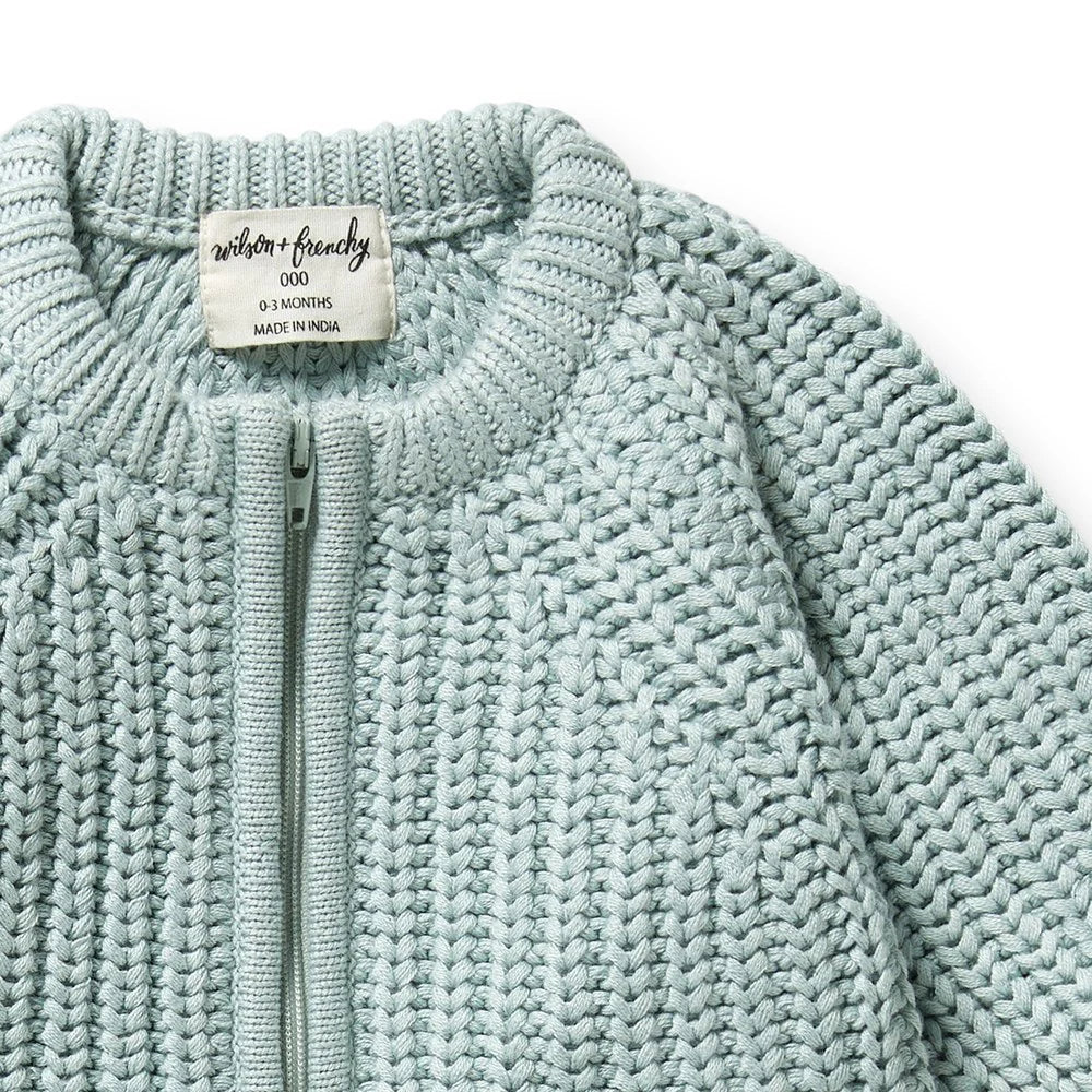 Made from a beautiful blend of organic cotton, bamboo and wool, this luxurious long sleeve knit growsuit features a chunky rib design and zip through opening for quick and easy nappy changes.