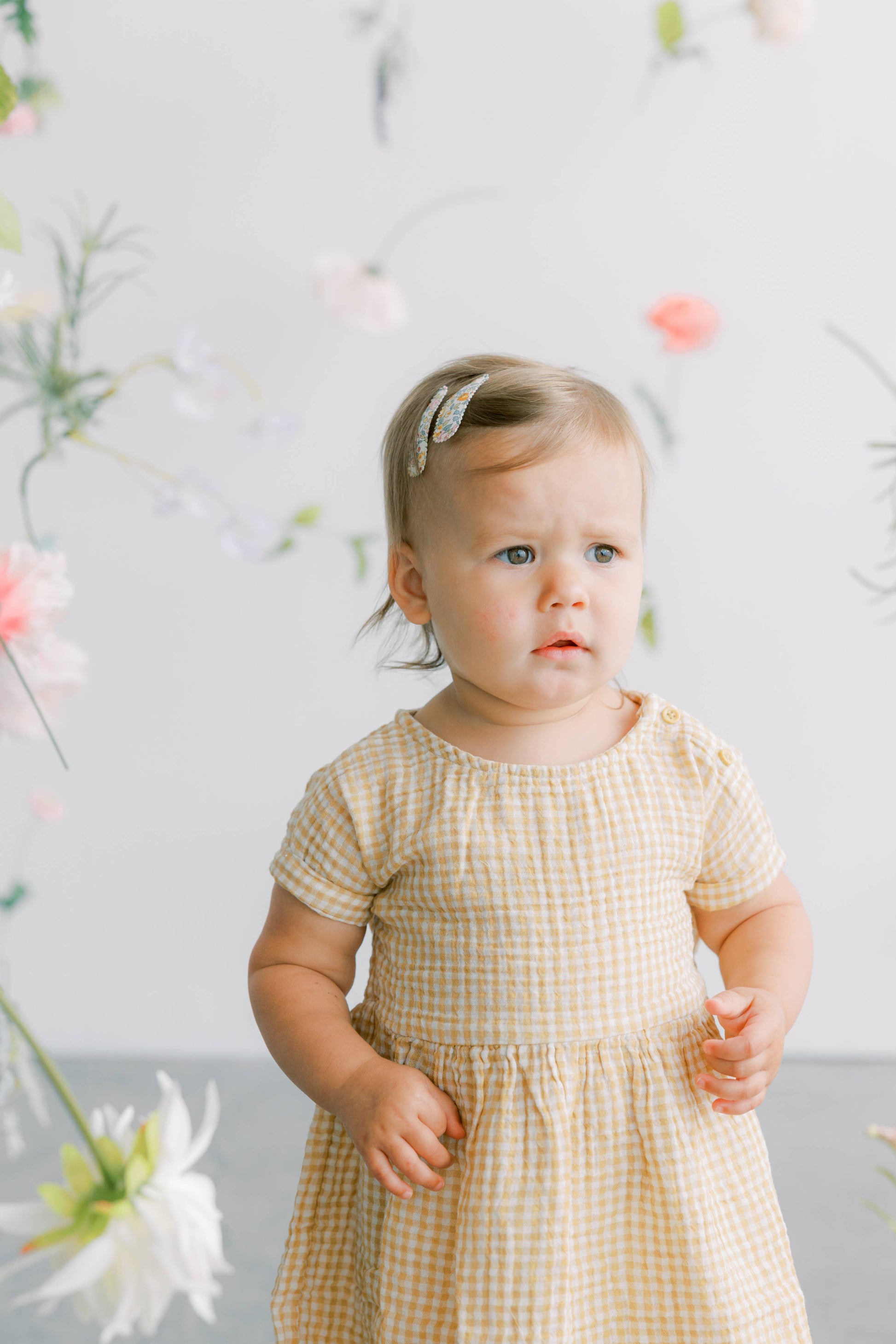 A beautiful set of fabric covered snap clips featuring a scalloped edge detail. Soft, comfortable and easy to wear. Our pretty hair clips are perfect for any age from toddler to adult. This hair clip set features a lovely vintage-inspired plaid fabric with embroidered detail. Perfect for fall & winter!