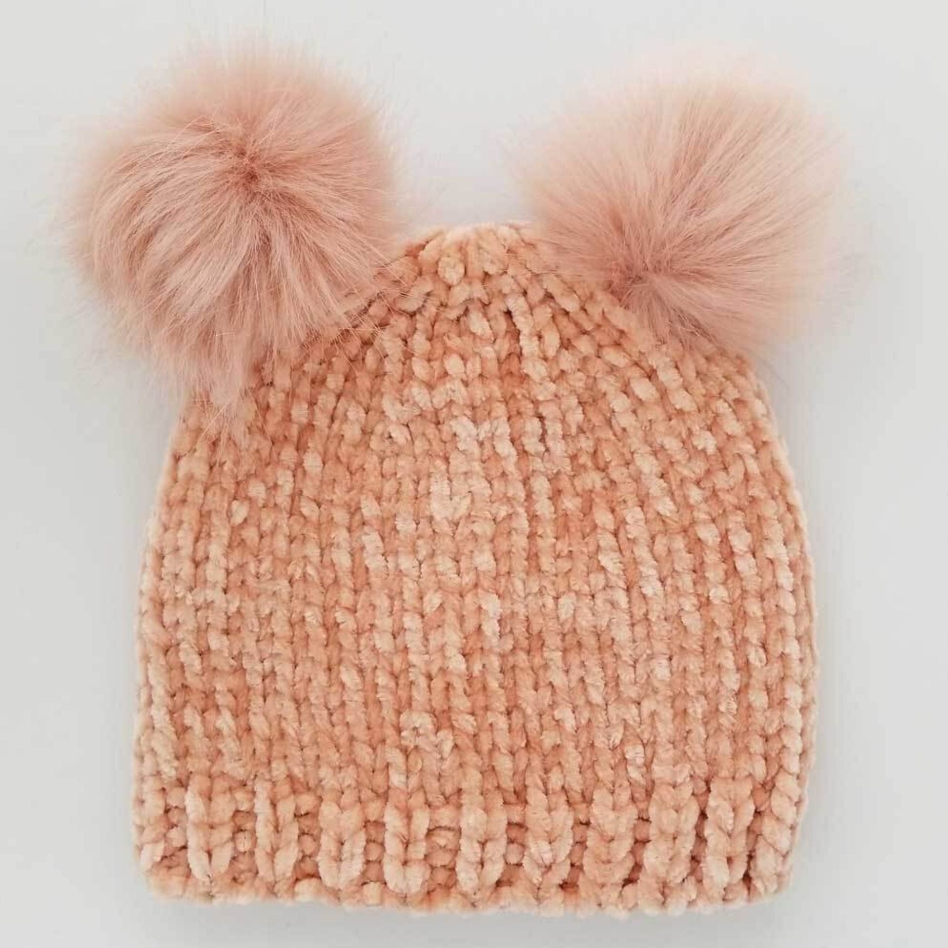 Super cozy hat hand knit in thin Chenille and topped with two furry pom poms to match!