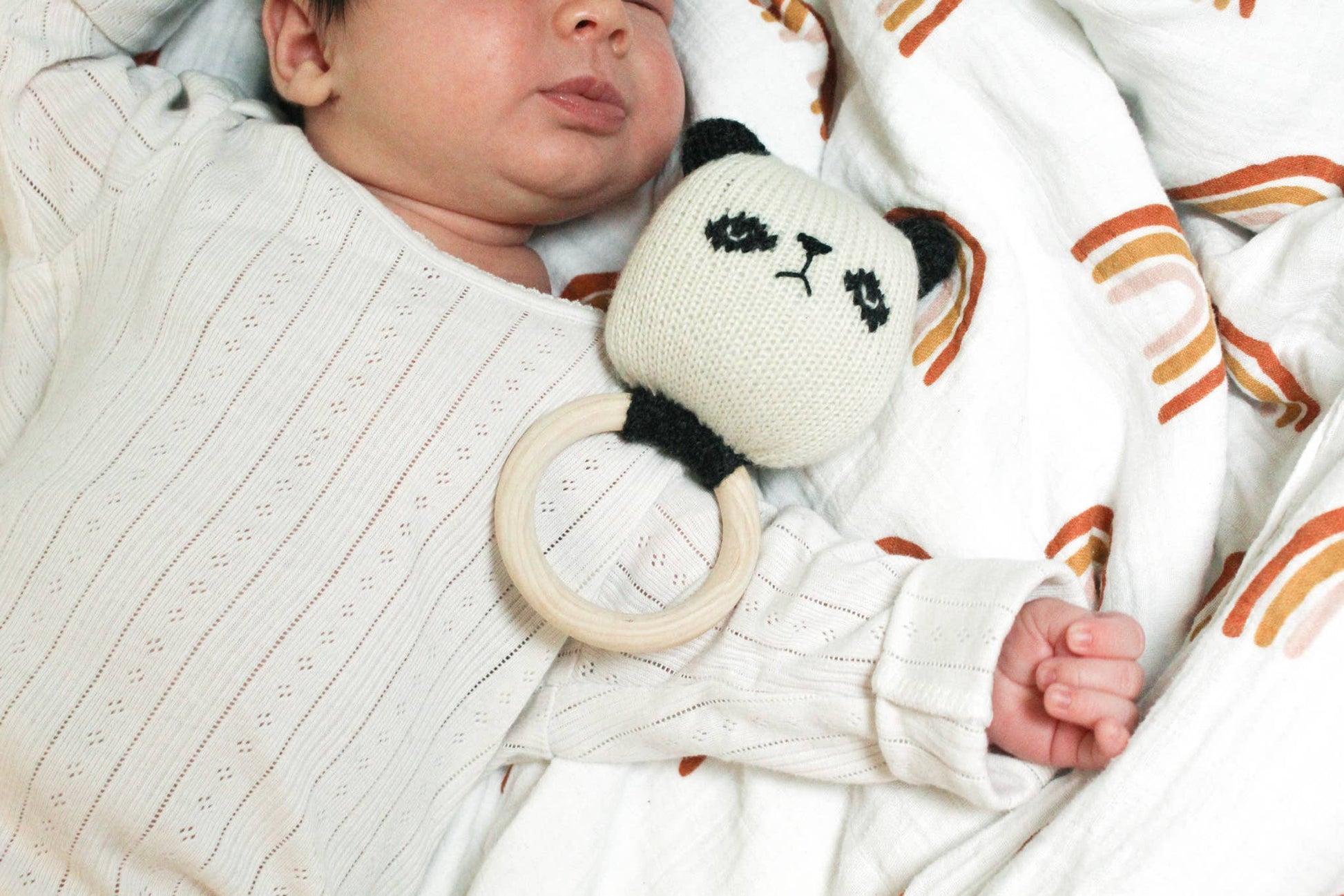 Handmade panda head rattle toy. Made from lambswool, and filled with stuffing made from recycled plastic bottles. Ring is made from  smooth, unbleached beechwood