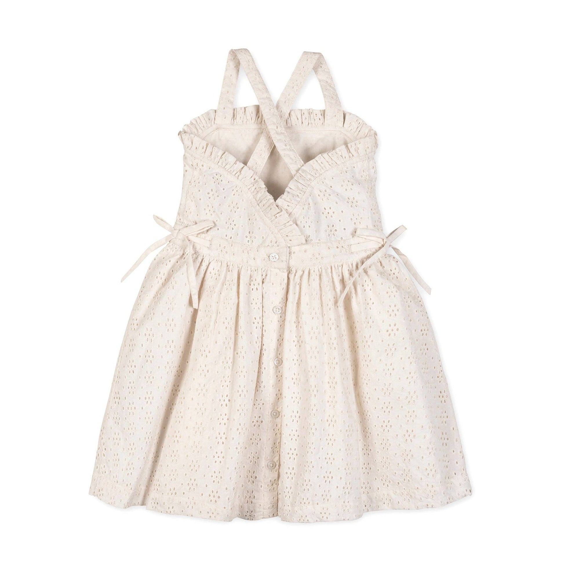 She'll be ready for every summer adventure in our airy organic cotton eyelet dress. Features feminine ruffle edges, cross back straps with adjustable buttons, and a button closure down the center back. A fun and fresh dress for the season ahead.