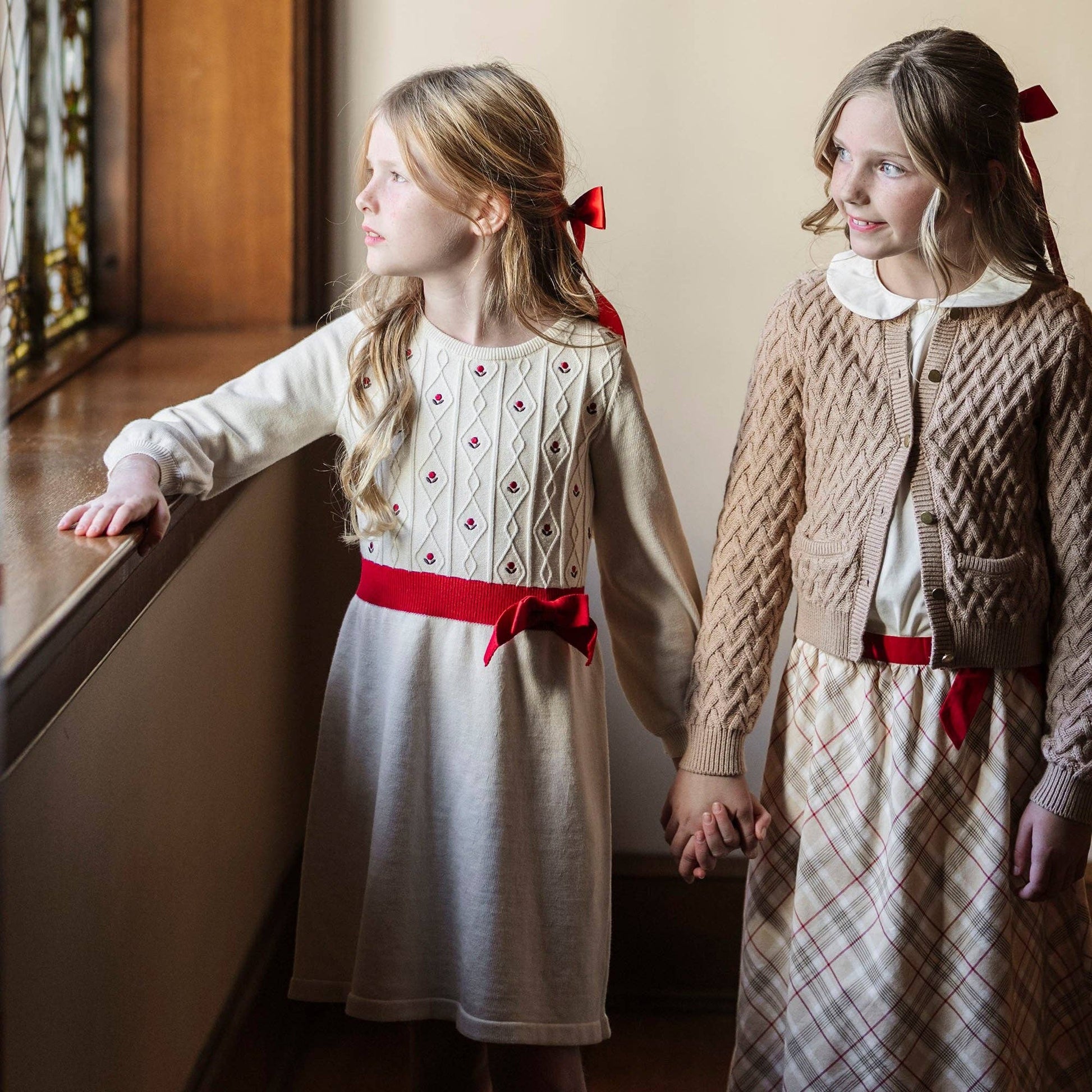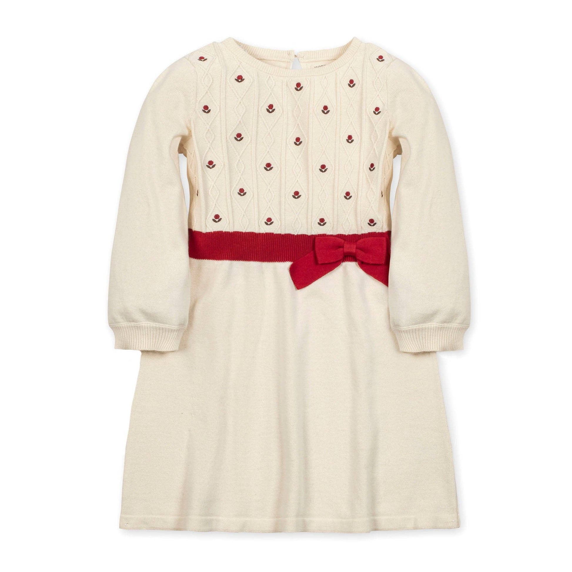 Our sophisticated long sleeve skater sweater dress in soft organic cotton exudes timeless charm for when temperatures start to drop. Features a beautiful cable knit bodice with embroidered details, decorative bow at the waist, and a back keyhole closure for easy dressing. Picture perfect and also so comfortable to wear.
