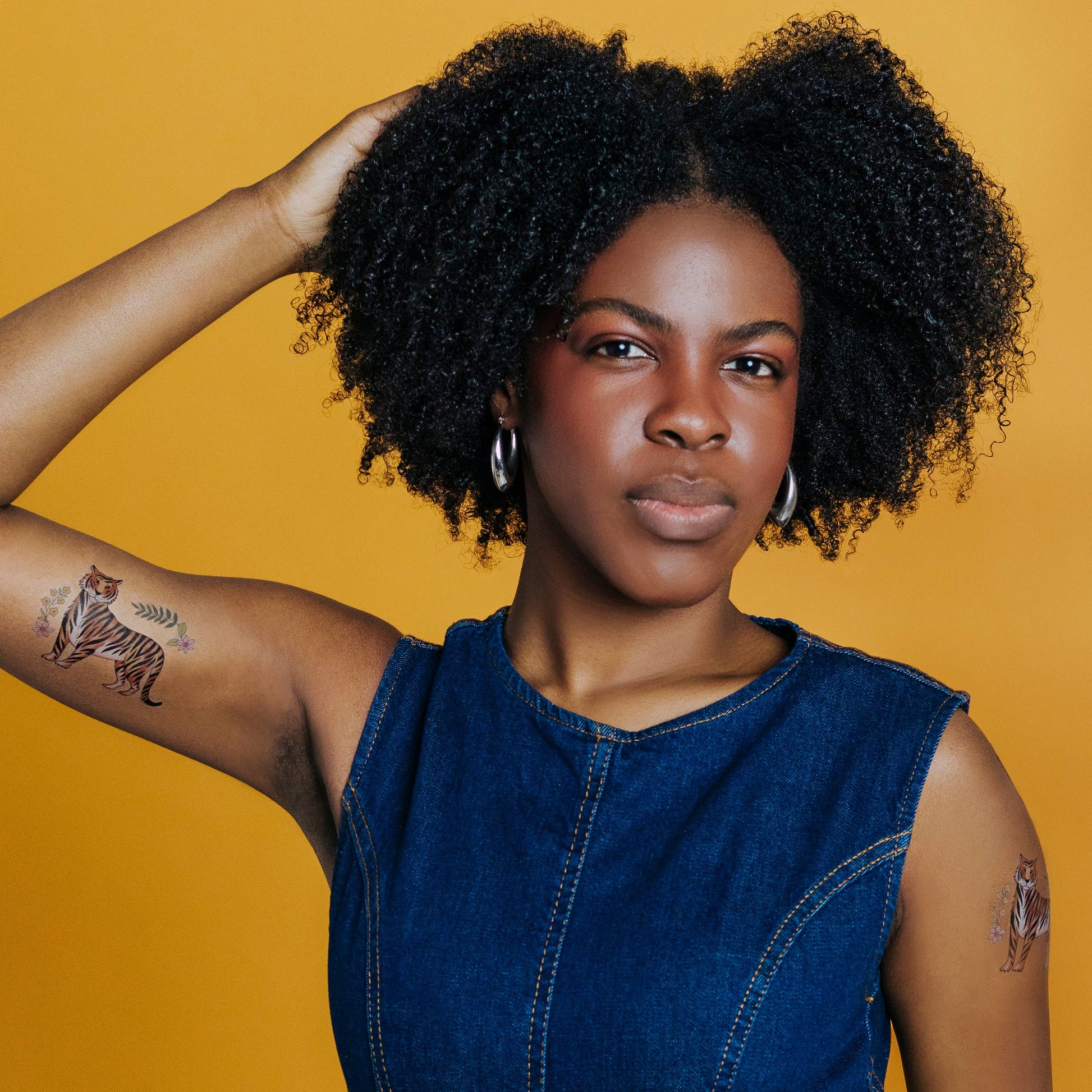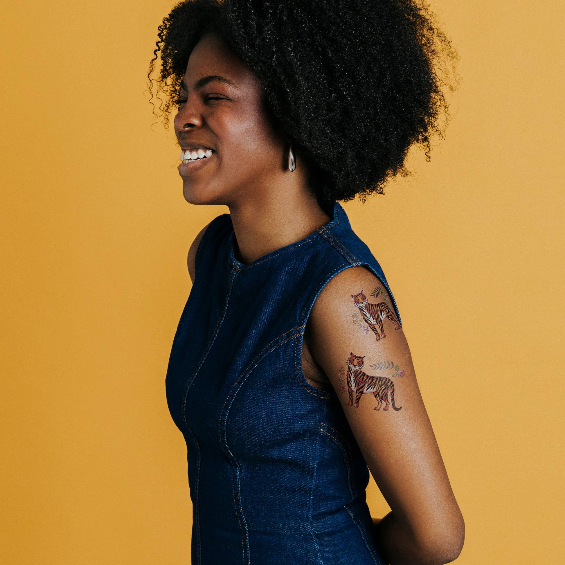 Showcase your style with our Regal Tiger Tattoo Pair from Tattly. This temporary tattoo features a striking design that's a wearable masterpiece. Each tattoo is made from high-quality, vegan, cruelty-free ink that lasts for 2-4 days and is water-resistant. Suitable for all ages, this pair of regal tigers offers a unique and artistic way to express yourself. Transform your look with Tattly's innovative temporary tattoos.